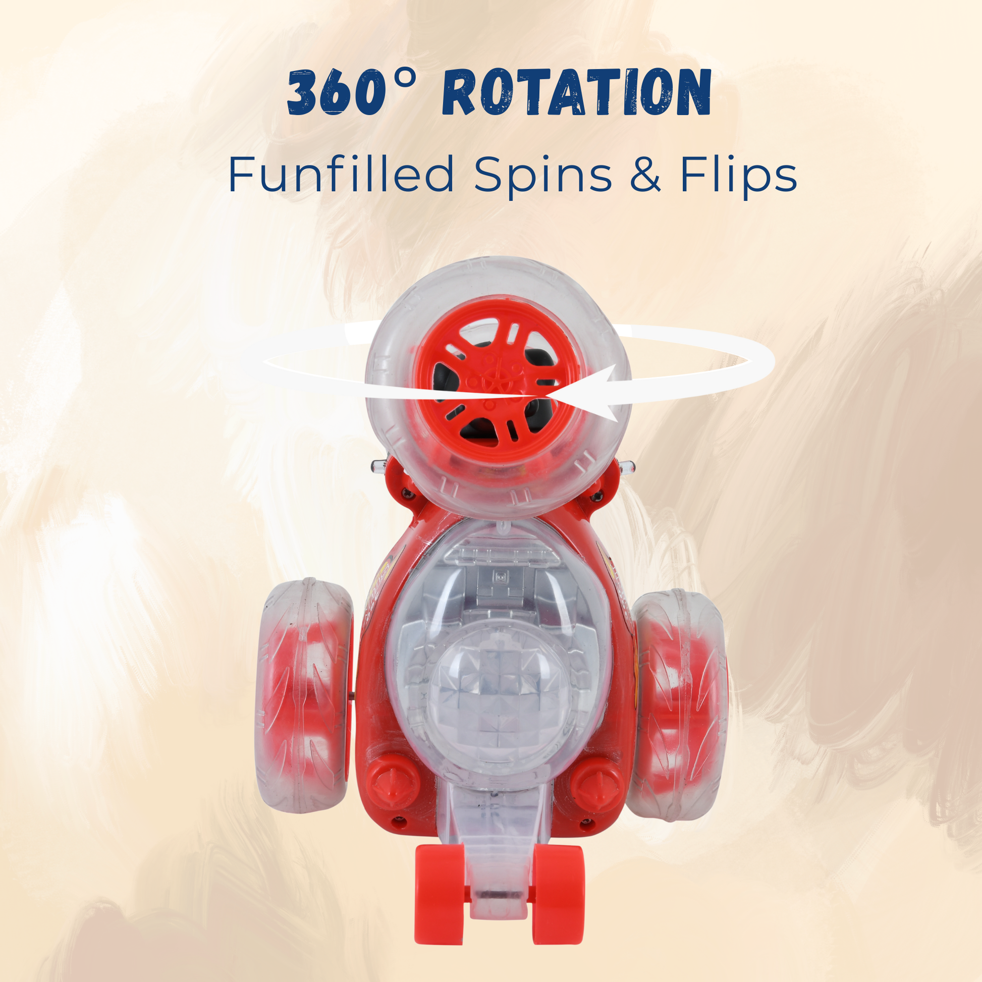 360ยฐ Rotating Stunt Car with Bright Lights and a DEMO feature. This cool racing car can do all sorts of tricks. Its powerful wheels and stunt design lets kids perform flips, spins, crazy tricks and race with ease. Bright LED lights make it extra fun to play withโday or night.